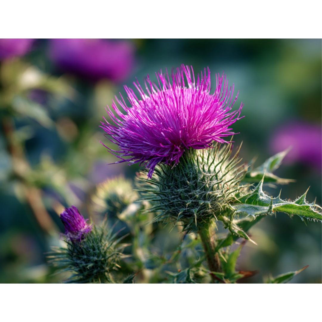 밀크시슬은 지중해 연안이 원산지인 식물로, ‘마리아 엉겅퀴’라고도 불리며 수 세기 동안 전통 약초로 활용되어 왔습니다. 뾰족한 흰줄무늬 잎과 보라색 꽃이 특징이며, 예로부터 간과 담낭 보호에 사용되어 왔죠.