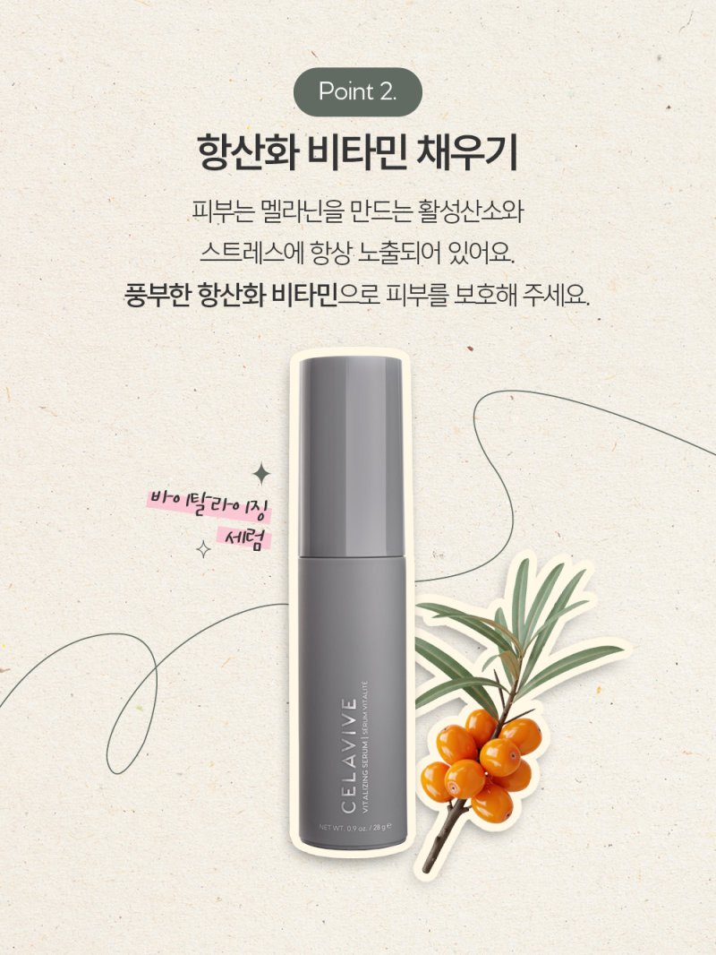 셀라비브 바이탈라이징 세럼은 비타민 성분이 풍부하게 함유돼, 외부 자극으로부터 피부를 보호하고 건강한 광채를 유지하게 도와줍니다.