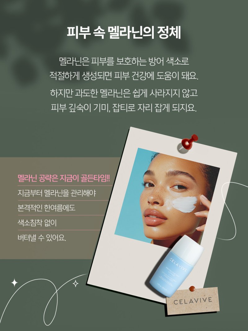 셀라비브 스킨케어 루틴으로 과도한 멜라닌 생성을 막고, 여름에도 맑고 투명한 피부를 유지해보세요.