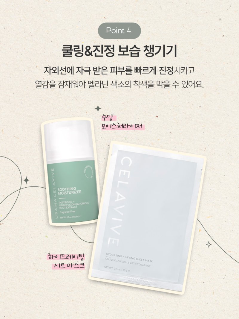햇빛에 자극받은 피부는 빠르게 진정시켜야 멜라닌이 색소화되는 것을 막을 수 있습니다.