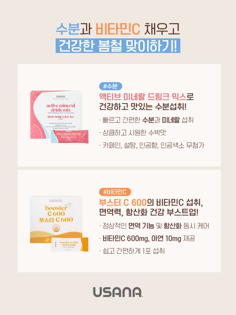유사나 액티브 미네랄 드링크 믹스와 부스터C600을 통해 미세먼지 걱정 없는 건강한 봄을 맞이하세요! 💖