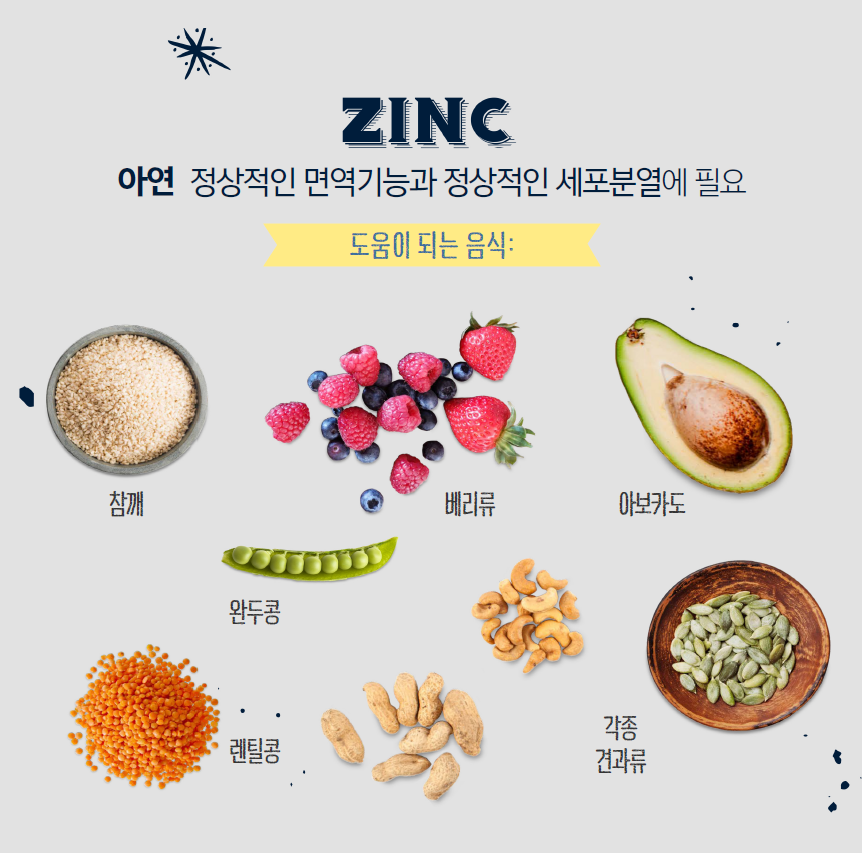 아연은 면역 기능 유지와 세포 분열에 중요한 역할을 합니다.