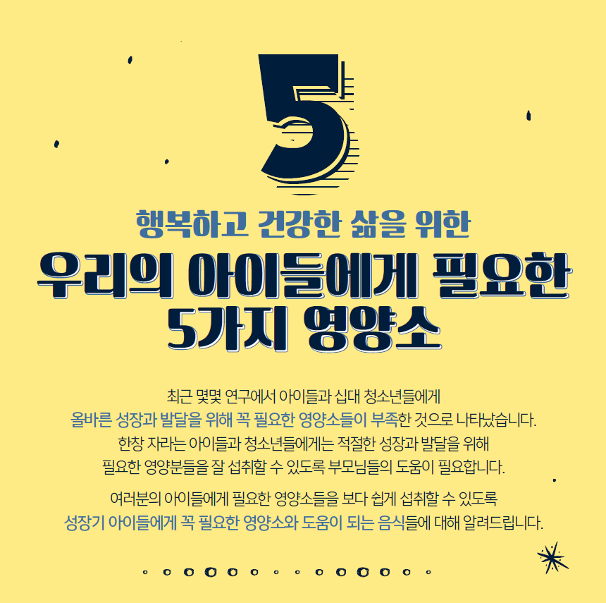 오늘은 성장기 어린이에게 꼭 필요한 5가지 영양소를 중심으로,