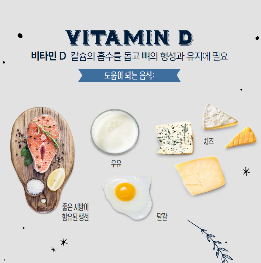 비타민 D는 뼈와 치아의 형성을 도와주는 필수 영양소입니다.