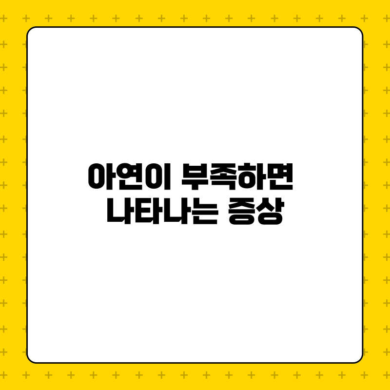 | 아연 부족 증상 | 면역력 저하, 피부 트러블, 성장 지연, 우울감, 집중력 저하, 호르몬 문제, 미각 저하 |