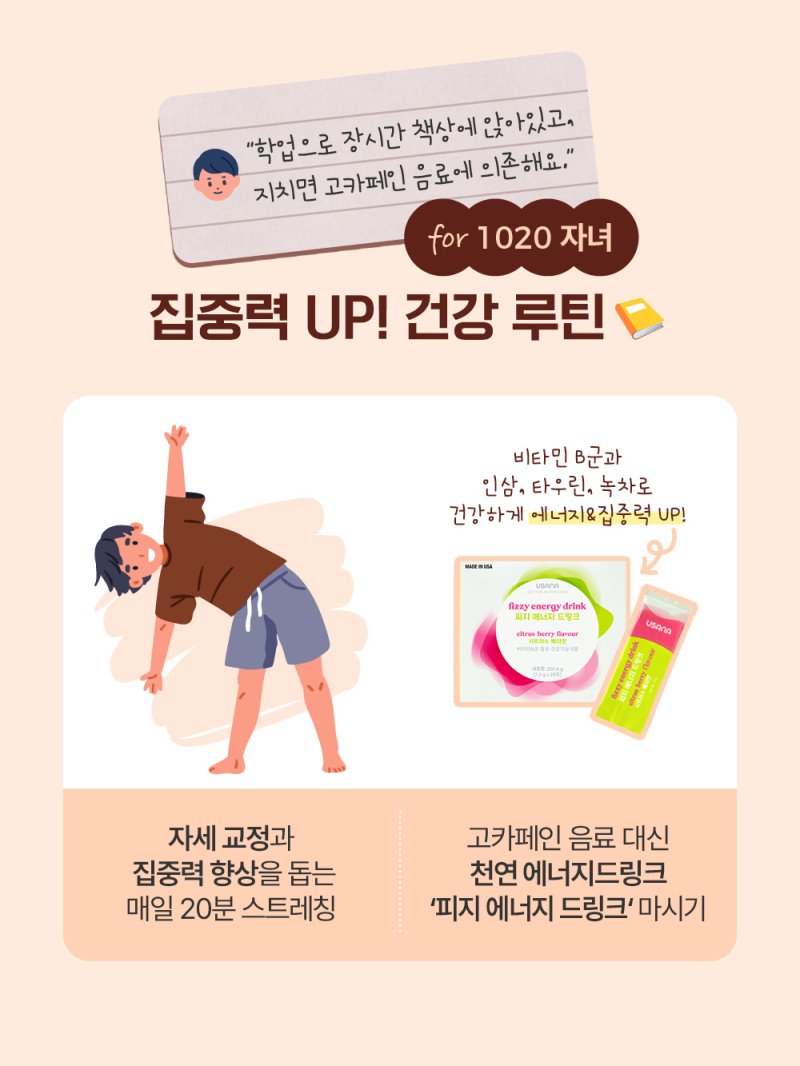 | 1020 자녀 | 집중력 저하, 피로 | 스트레칭 + 에너지 보충 | 피지 에너지 드링크 |