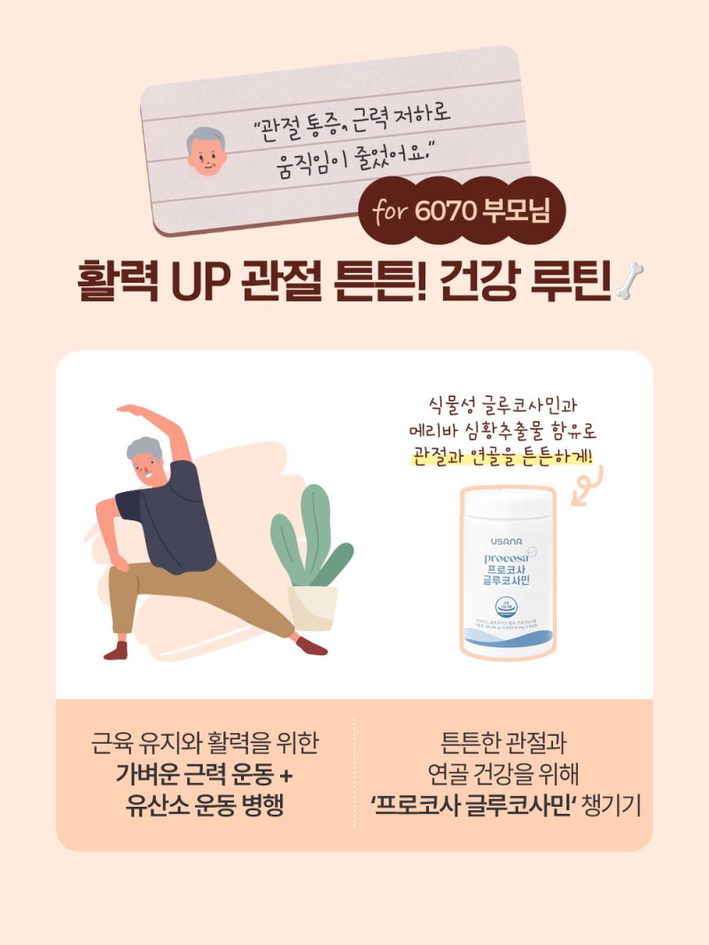 | 6070 부모 | 관절 통증, 근력 저하 | 가벼운 근력운동 + 관절 관리 | 프로코사 글루코사민 |
