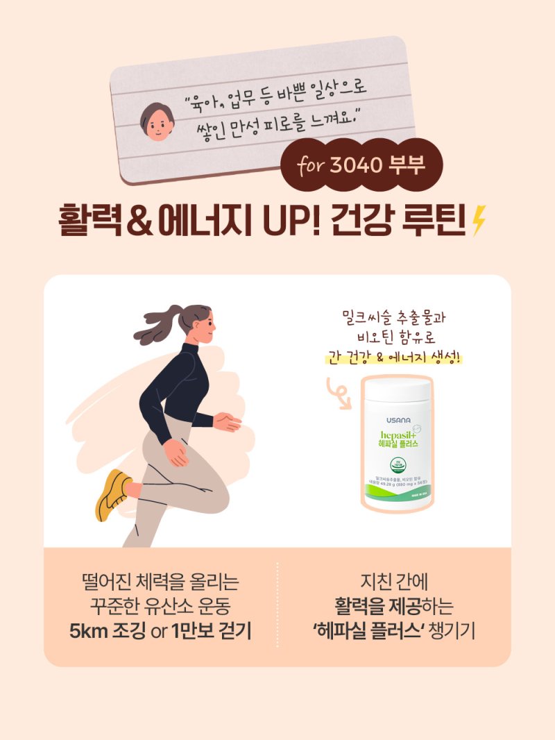 | 3040 부부 | 만성 피로, 간 건강 | 유산소 운동 + 간 케어 | 헤파실 플러스 |