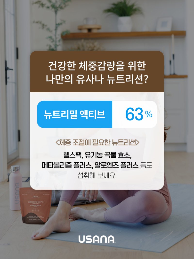 유사나 코리아 공식 인스타그램에서 진행된 설문조사에 따르면, 체중 감량을 위한 최고의 제품으로 뉴트리밀 액티브가 63%의 압도적인 지지율을 얻었습니다.