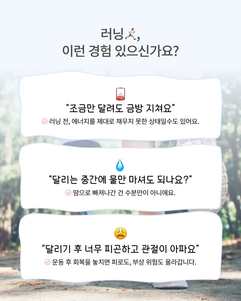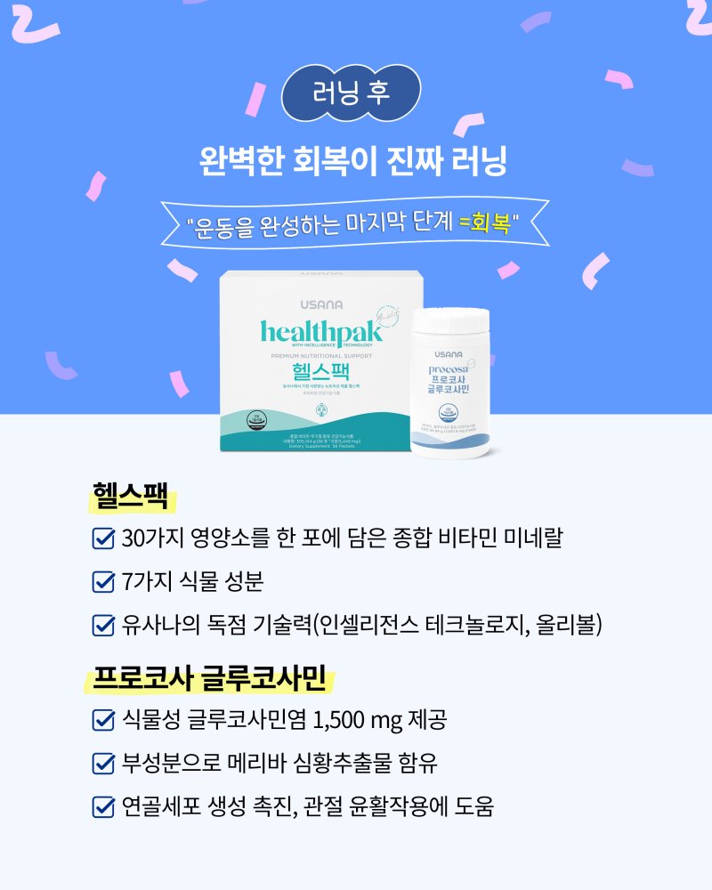 • ✔ 러닝 후, ‘헬스팩과 글루코사민’으로 회복력 강화 & 관절 케어