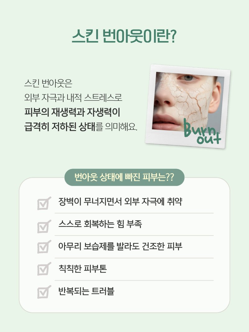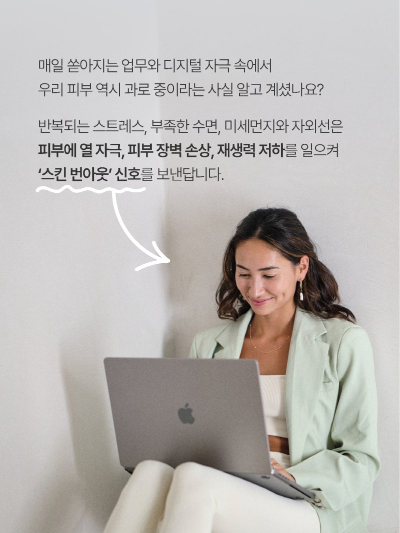 바쁜 업무, 불규칙한 수면, 미세먼지, 자외선, 디지털 기기 사용 등 현대인의 일상은 피부에 쉼을 허락하지 않습니다. 이처럼 지속적인 자극과 스트레스로 피부가 지치는 현상, 바로 ‘피부 번아웃(Skin Burnout)’입니다.
