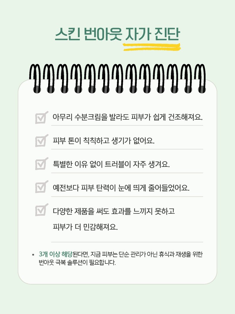 수분을 아무리 공급해도 건조하고, 갑작스럽게 트러블이 올라오고, 탄력은 줄고, 피부톤은 칙칙해졌다면 지금이야말로 피부에 재생과 회복이 필요한 시점입니다.