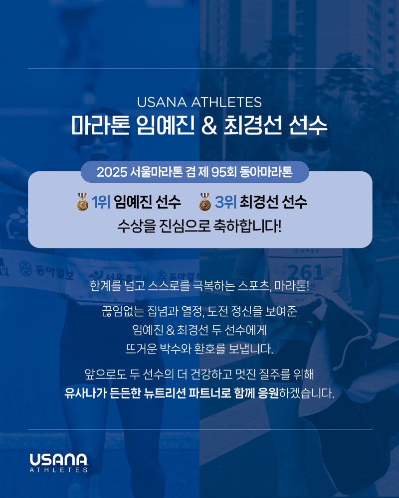 마라톤은 단순한 스포츠가 아닙니다. 한계를 넘고, 스스로를 극복하는 도전의 연속이죠. 유사나는 임예진 & 최경선 두 선수의 끊임없는 노력과 열정을 응원하며, 건강한 질주를 위해 든든한 뉴트리션 파트너로 함께하겠습니다.