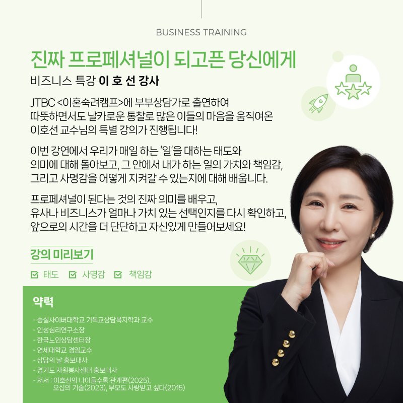 JTBC <이혼숙려캠프> 등 다양한 방송 출연 경험이 있는 이호선 교수가 진행하는