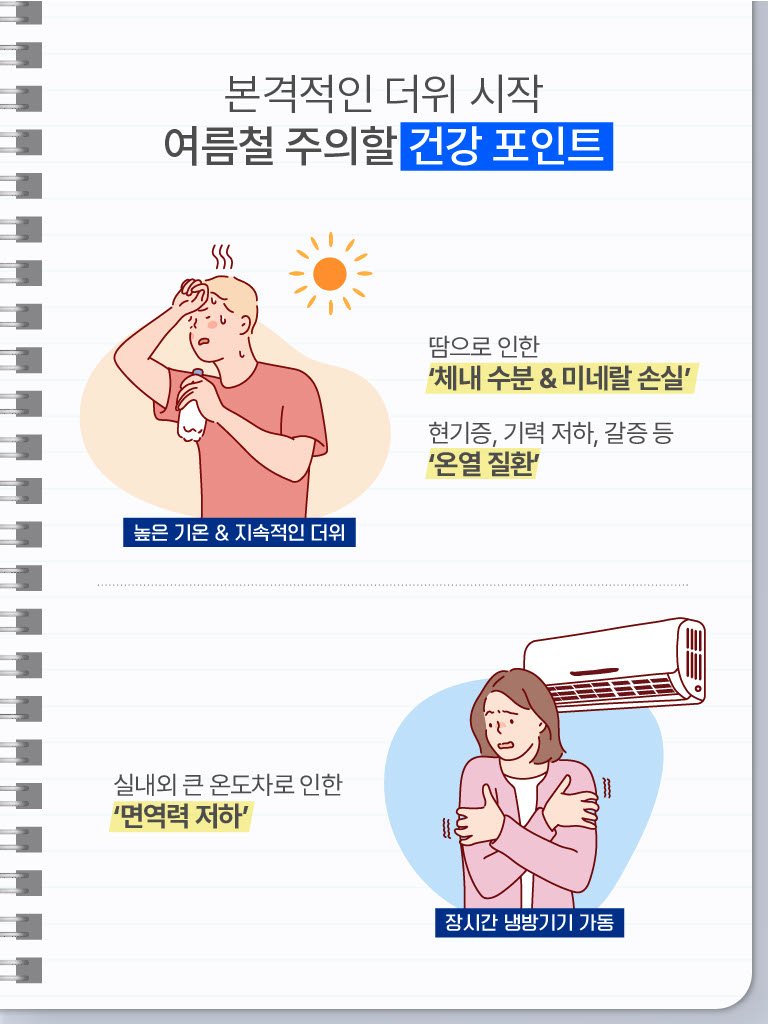 이로 인해 땀으로 체내 수분과 미네랄이 빠르게 손실되고, 실내외 큰 온도차는 면역력 저하를 일으키기 쉽습니다.