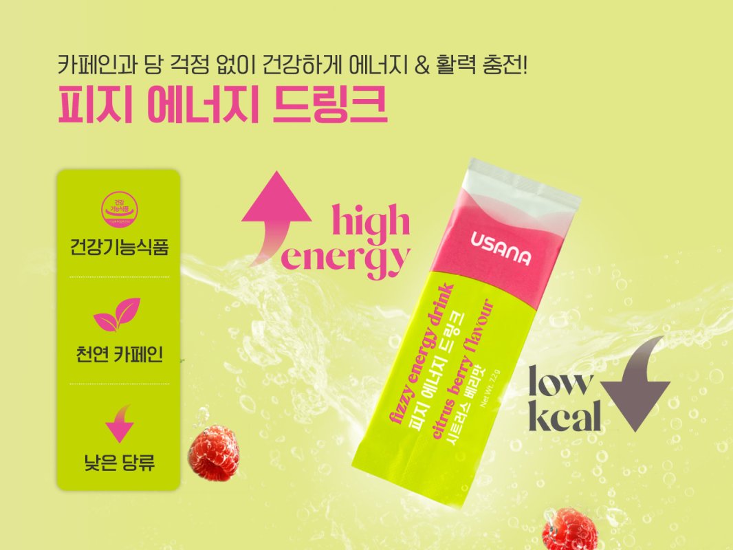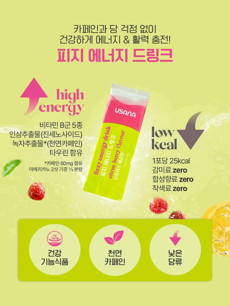 - ✅ 설탕 ZERO / 감미료 ZERO / 합성향료 ZERO / 착색료 ZERO — 기존 에너지 드링크의 단점 제거