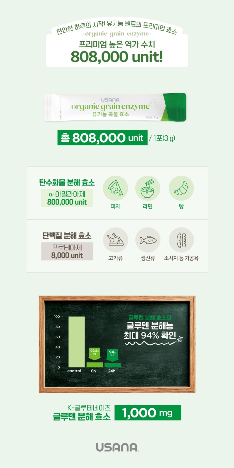 유사나 유기농 곡물 효소는 808,000unit의 높은 효소 활성도를 가지고 있어 소화 건강을 효과적으로 개선하는 데 도움을 줍니다.