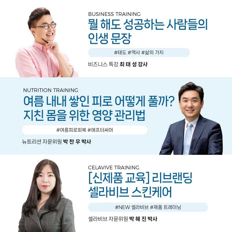이번 8월 행사에서는 비즈니스, 뉴트리션, 스킨케어 세 가지 핵심 분야의 전문 강연이 준비되어 있으며, 현장 방문자들을 위한 선착순 특별 선물과 출석 스탬프 이벤트도 함께 진행됩니다.
